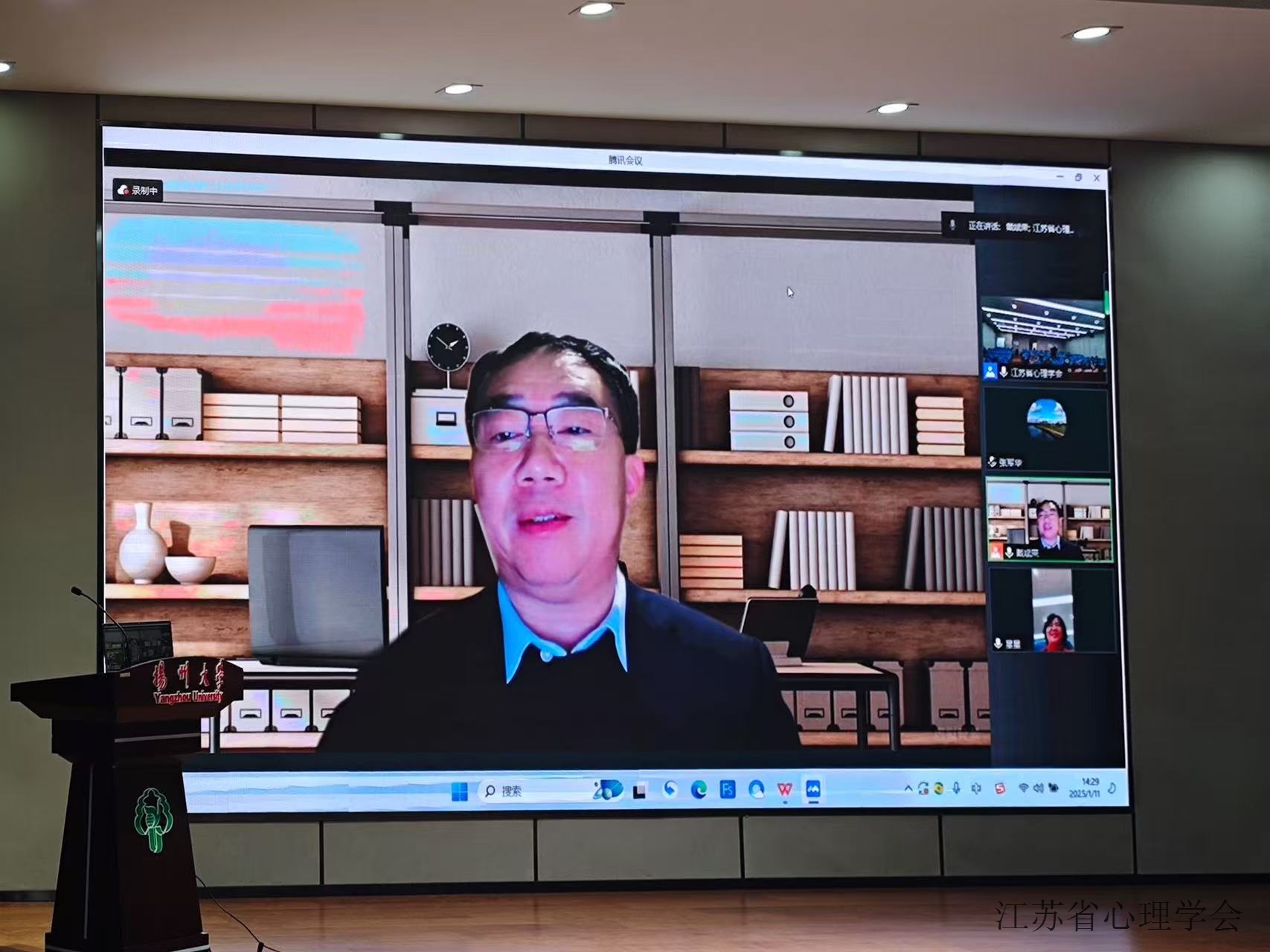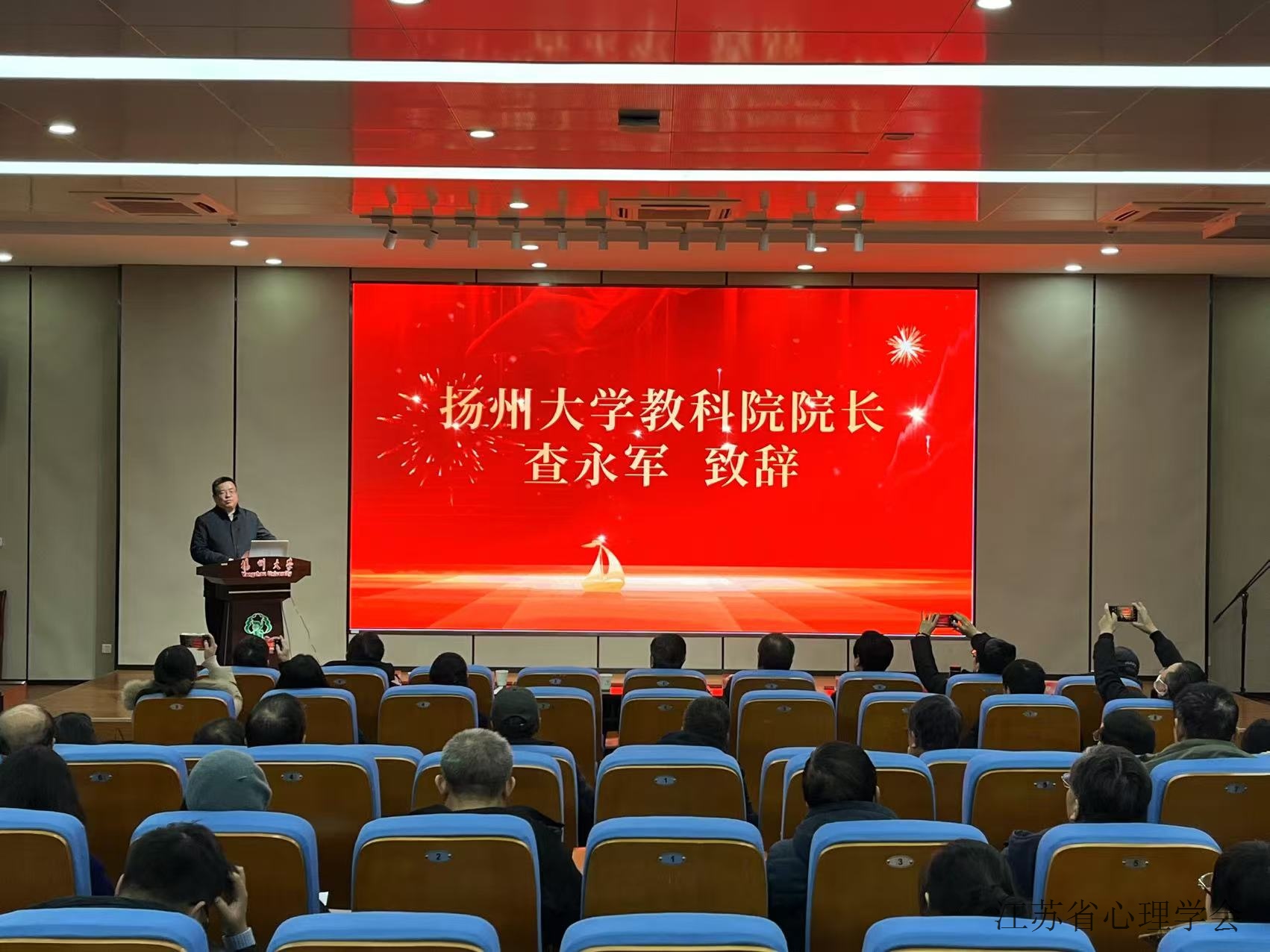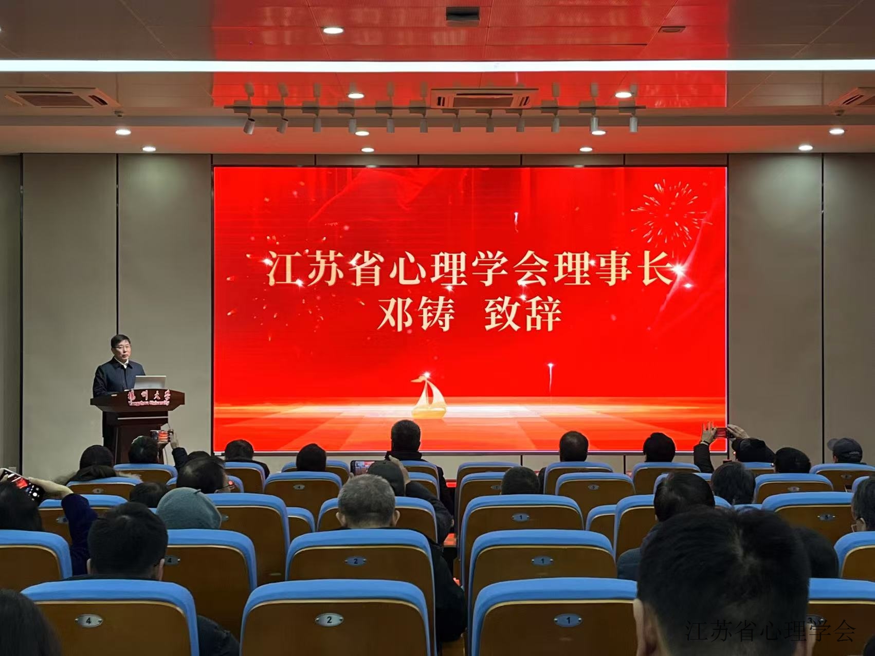 紧接着,江苏省心理学会理事长、南京师范大学心理学院邓铸教授致辞。邓理事长首先对会议的顺利召开表示祝贺,对莅临会议的全体理事、监事、各分支机构负责人、各地市心理学会负责人欢迎和衷心感谢,对大家在过去一年中的努力工作、取得的丰富成果和特色创新探索表示感谢和赞赏。他还专门对扬州大学校领导、教科院领导、师生志愿者为大会召开提供的支持、服务表示感谢。邓理事长还深情地表达了对费俊峰教授的追思和感谢,以及大学生心理专委会的人员调整情况,请参会代表审议并通过了由南京师范大学心理学院党委书记周红教授接任大专委主任委员的决定。他还通报了学会因应相关高校巡视组对学会理事任期的建议所作的人员调整情况。最后,理事长祝全体理事、监事、与会代表在即将到来的蛇年春节愉快,新的一年中成果丰硕、阖家幸福。