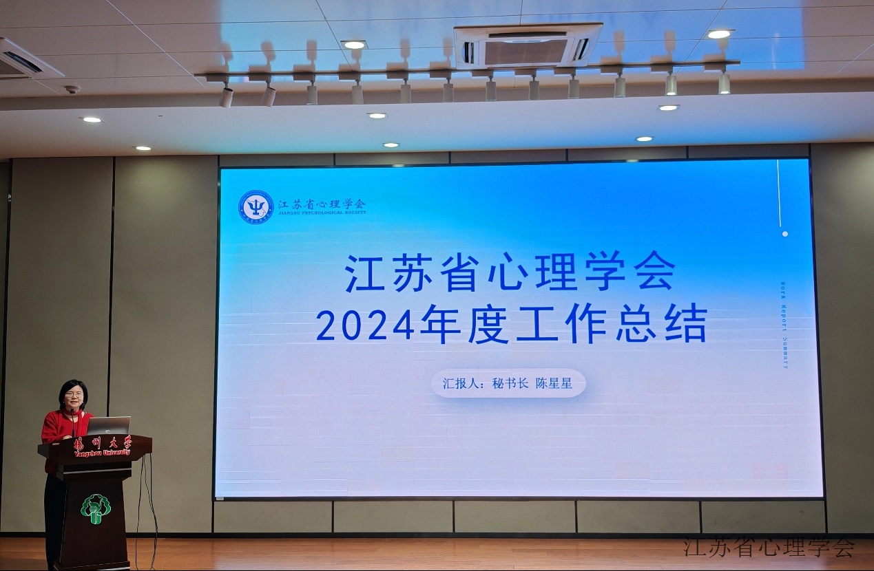 党课学习后,陈星星秘书长作江苏省心理学会2024年工作总结暨2025年重点工作报告。在过去一年,江苏省心理学会自身建设成果斐然,在党建引领、会员服务升级、分支机构管理及宣传推广方面成效显著。此外,围绕“四服务”——即服务科技工作者、服务全民科学素养、服务创新驱动发展、服务党和政府决策的核心任务,江苏省心理学会在过去一年中不仅通过组织高质量的学术年会与专题论坛为科技工作者搭建交流平台,还深化实践合作,开展了一系列公益心理科普与心理健康促进活动,积极推动心理学研究成果的转化应用,与企业、学校等社会各界合作探索创新应用,并积极参与决策咨询。陈星星秘书长基于学会2024年的建设基础,代表学会介绍了2025年的重点工作。2025年,学会将持续强化党建引领,积极配合中国心理学会换届工作,加强学会制度建设和管理,提升服务会员能力,全方位推进学会工作,为江苏乃至全国心理学科繁荣与社会心理健康事业发展不懈努力。